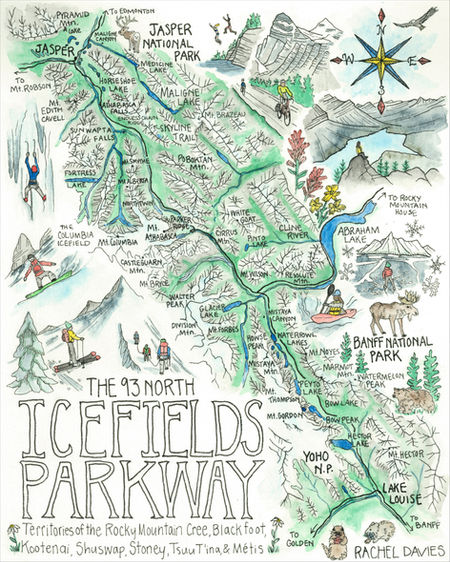 For the first time ever, the Short Little Guide series was shown as a full collection of 30 illustrations. My series of adventure map, painted gear, and landscapes were shown alongside my Canmore skyline mural.